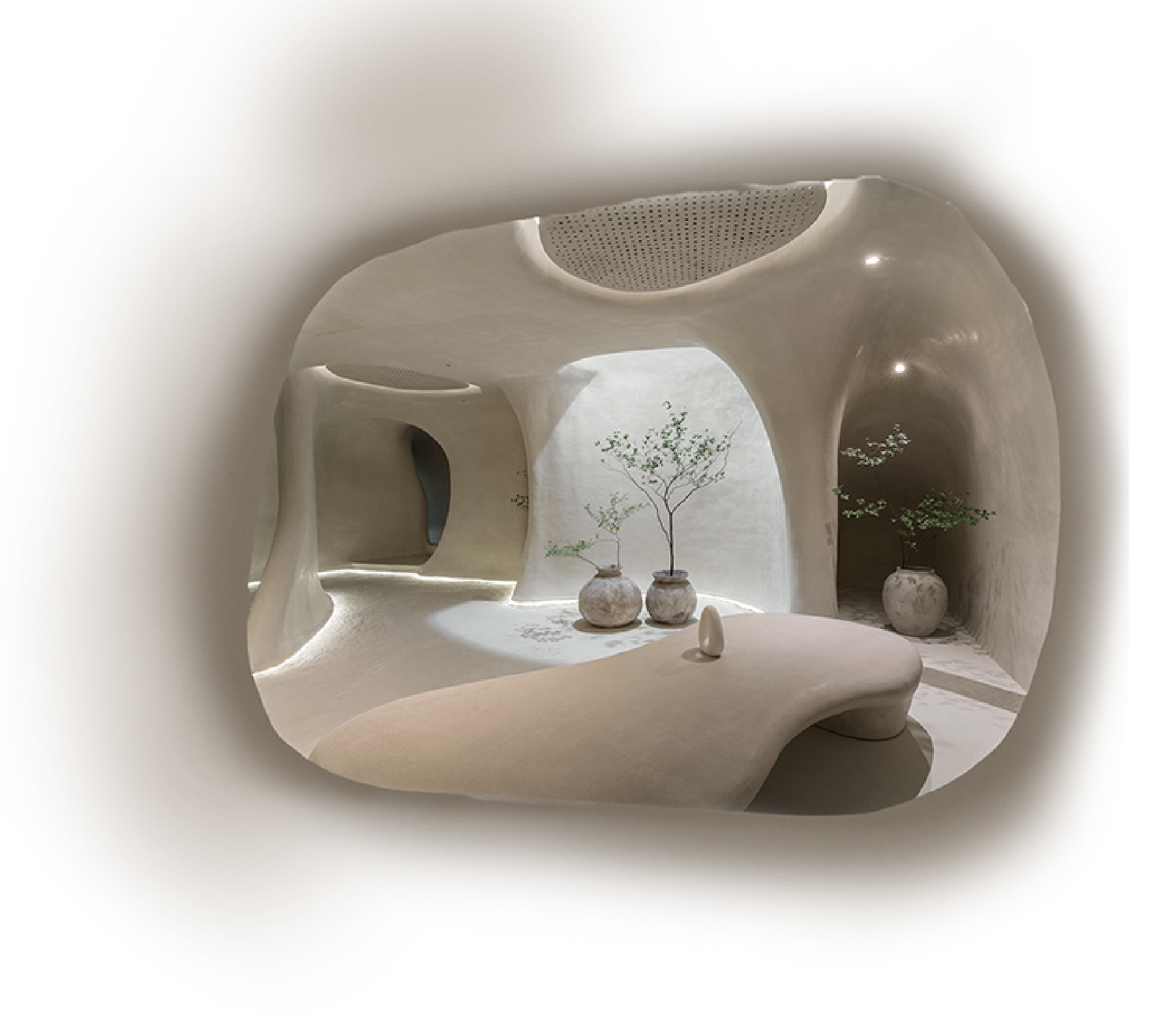 We developed various systems of structures and utilised a variety of lightweight materials, that achieves subtle layering effect of undulating curves that blend surrounding walls and ceilings into one.